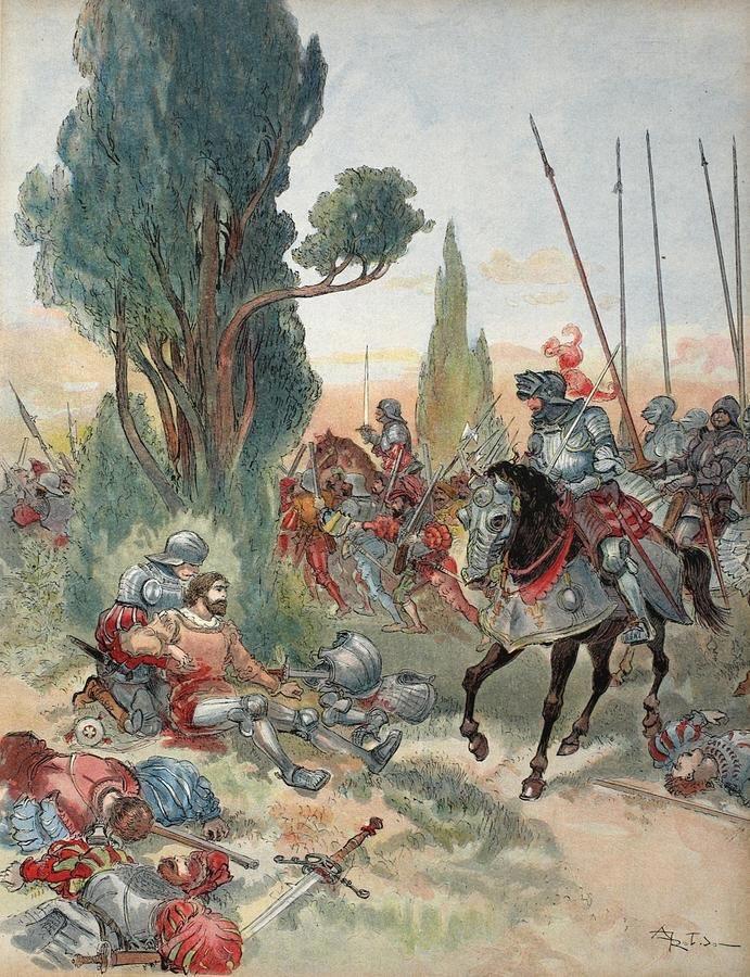 "И нынче, прорубая путь среди изменников величайшего короля, был он поистине страшен и ничуть не походил  ни на почтительного и благородного вассала, коленопреклоненно благодарящего сюзерена за милость, ни на  благочестивого прихожанина, которым его знали товарищи. Сам Аид мог бы выглядеть как этот кабальеро и речи его, когда он принял командование над брошенным лагерем, были столь же устрашающи, как и его дела."