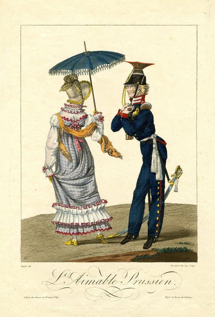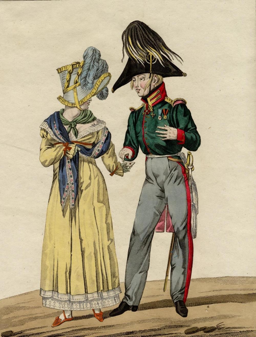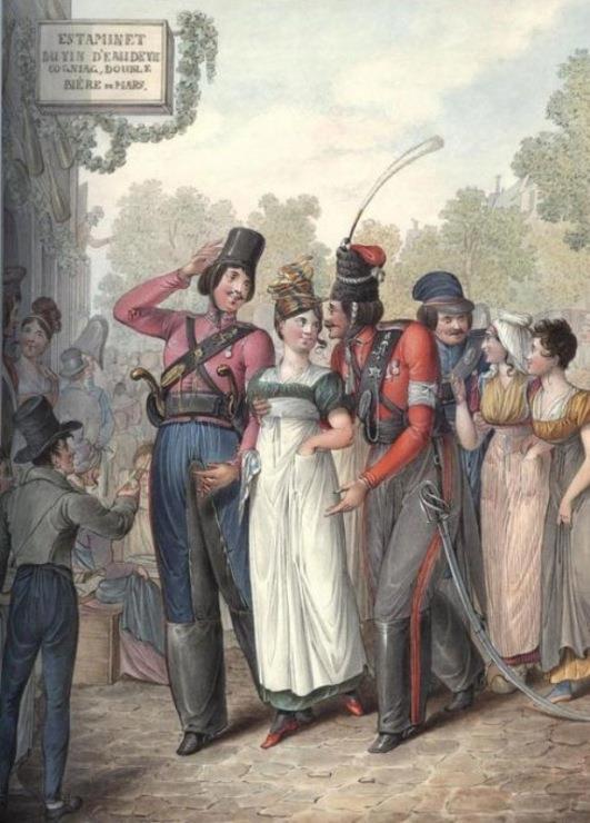 Сценка на улице Парижа: австрийский офицер, казак и русский офицер прогуливаются с двумя парижанками