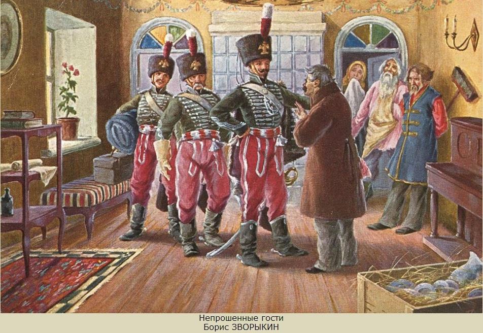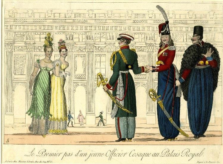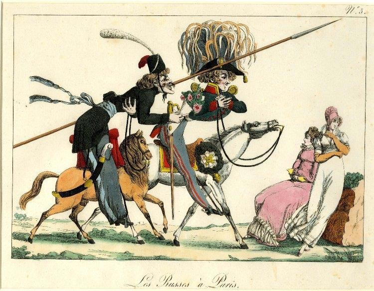 Русские французам виделись незлобливыми, но и не слишком деликатными в обращении великанами. Как писал декоратор парижских празднеств Александра I Пьер Фонтен: "Сегодня ко мне явилось четырнадцать гигантов-казаков с лошадьми и поклажей, заявив, что у них имеется распоряжение занять мой дом и столоваться у меня. Я решил смириться с первым пунктом этого требования, чтобы хотя бы избежать второго".