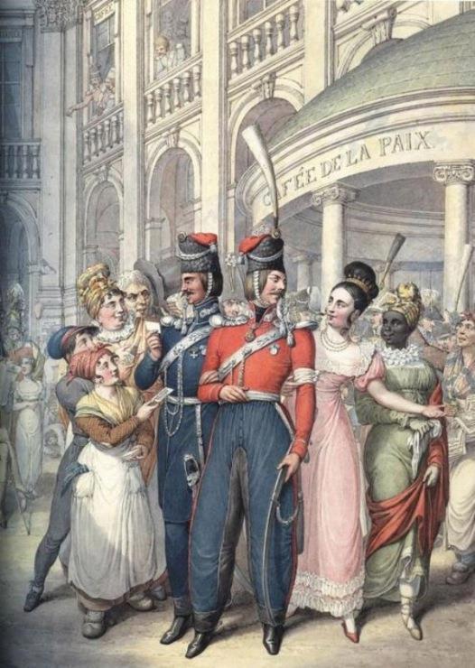 Однако по сравнению с пруссаками и австрийцами русские у парижан пользовались несравненно большей симпатией. Некий французский офицер признавался Николаю Тургеневу: "Я говорю с вами как с другом, потому что ваши офицеры и солдаты относятся к нам по-дружески. Ваш Александр — наш защитник и благодетель, но ваши союзники - настоящие канальи и кровопийцы!". Вероятно, имелись в виду распоряжения Александра I жестоко пресекать мародерство и грабежи (в частности, расхищение картинной галереи Лувра).