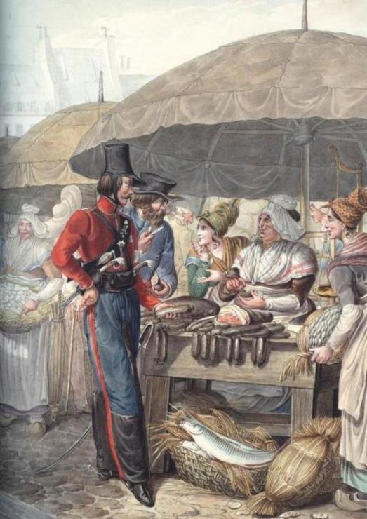 Уличная сценка: казаки и торговки рыбой и яблоками