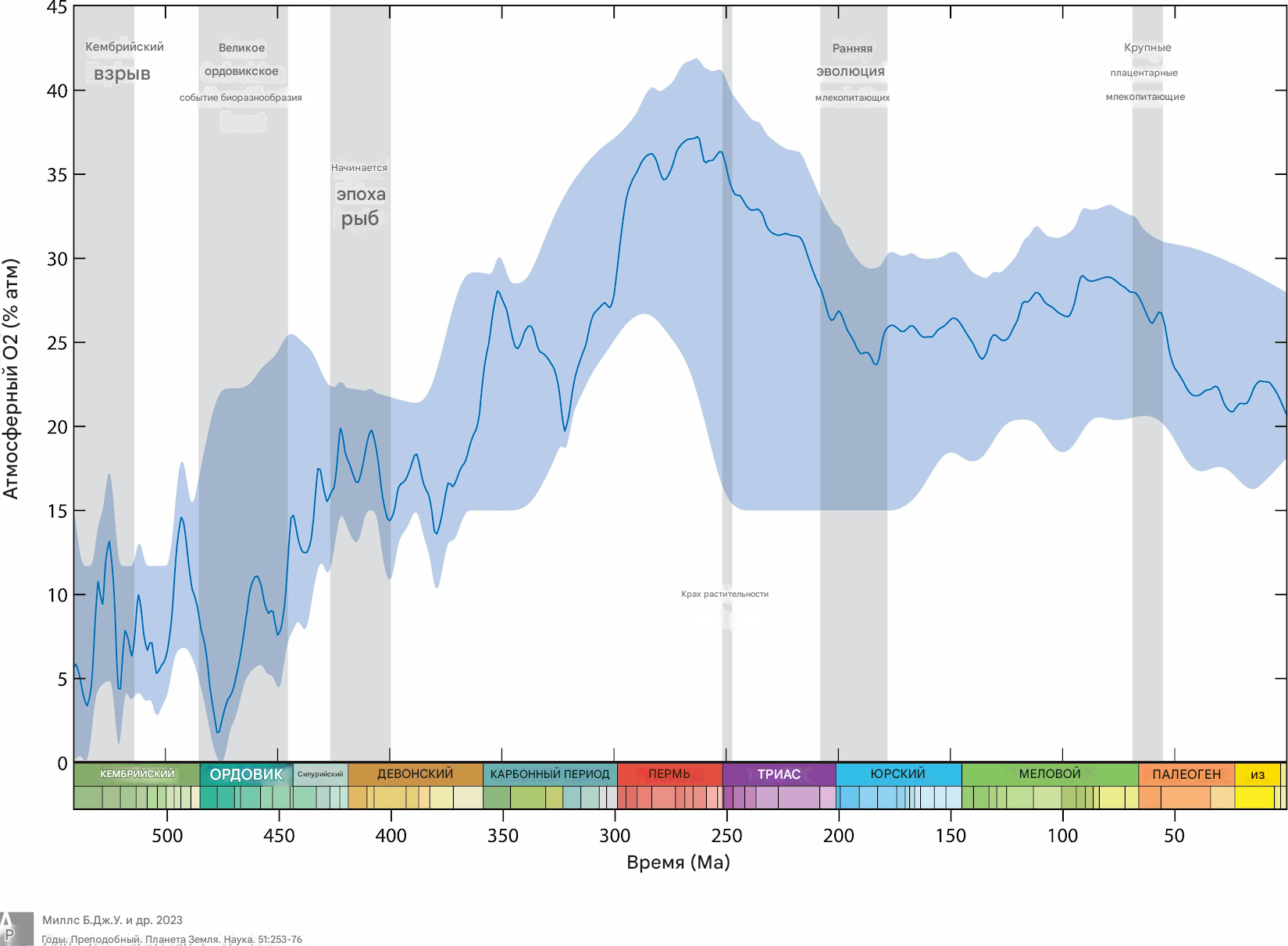 График с уровнем кислорода в фанерозое, который жизненно необходим земным организмам для дыхания: