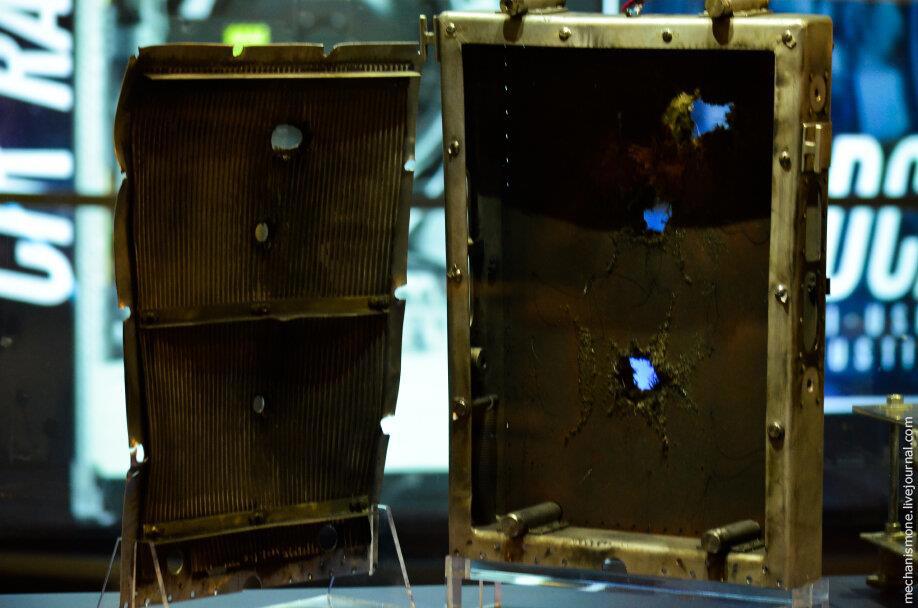 За стеклом можно рассмотреть обратную сторону поврежденного кусочком пластика алюминиевого панциря.