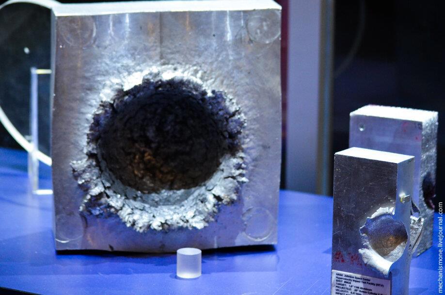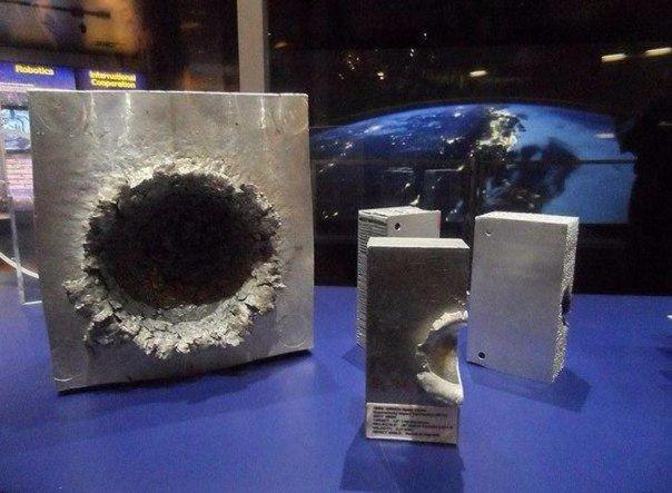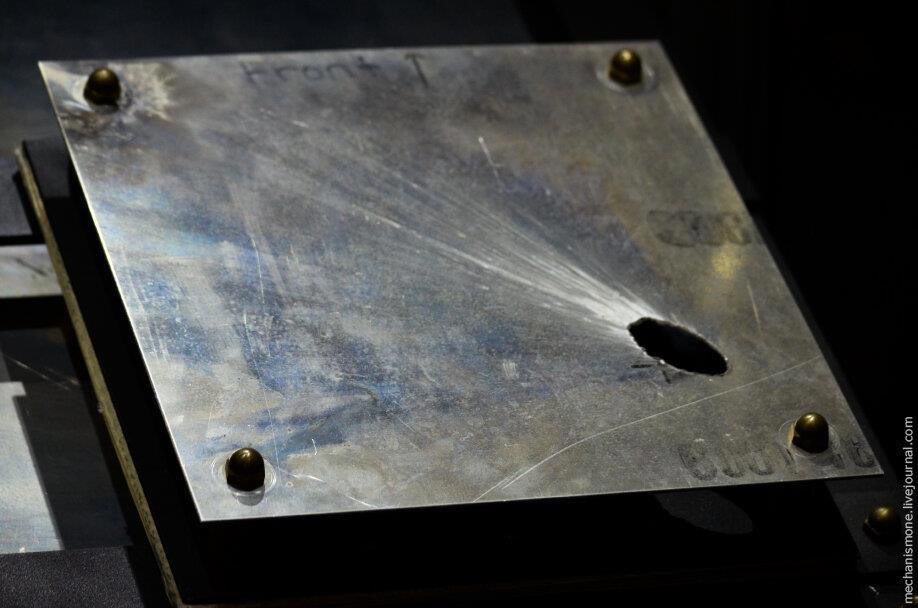 Вот такой лист стали защищает снаружи все важнейшие блоки космической станции. Отверстие пробито болтом 6х12 мм, который влетел в него на скорости 6410 м/с.