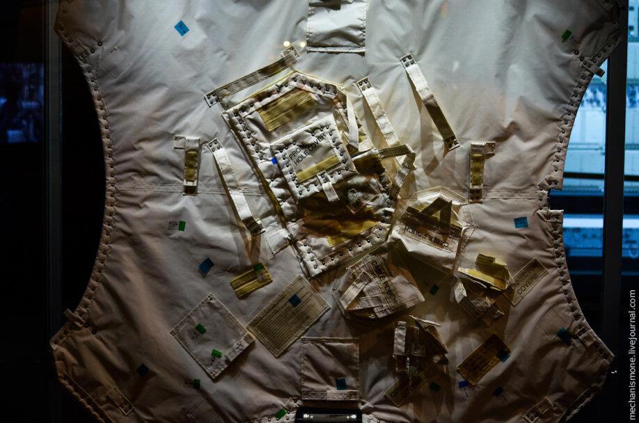 Так выглядит брезентовый щит, что используют для закрытия стыковочных люков между станциями во время строительства. Конечно, брезент тут не простой, а состоящий из множества слоев: тут и стекловолокно, и керамика, и особое стекло, и сверхпрочные волокна из стали. Большие "заплатки" закрывают окошки, которыми пользуются при космических работах. А вот маленькие синие и зеленые наклейки прикрывают следы от попадания космического мусора за те два года, которые этот брезентовый щит отработал на МКС.