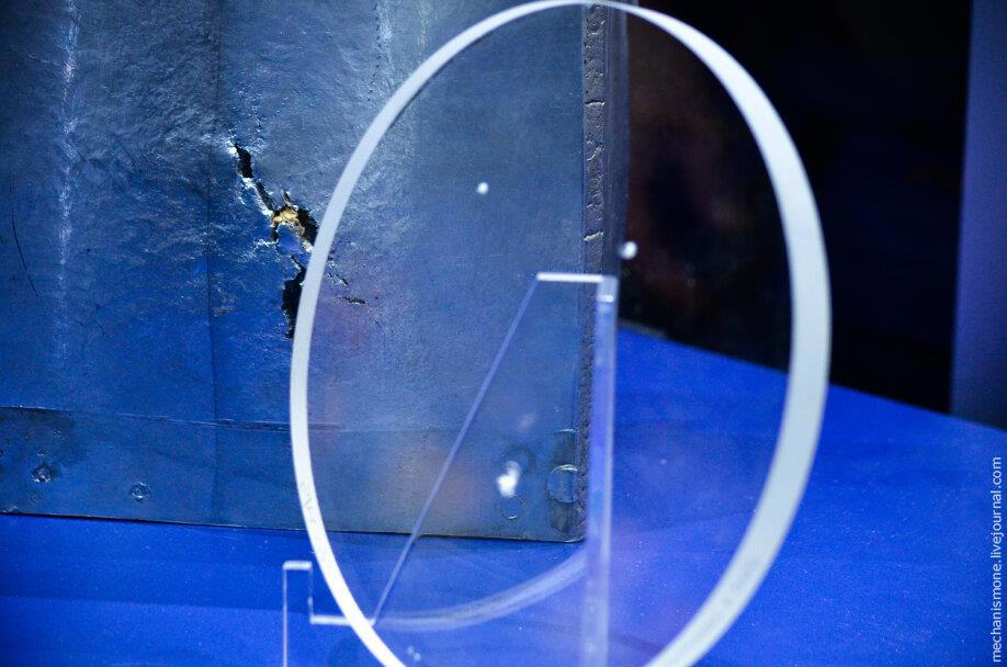 Стекла в космических иллюминаторах ставят также сверхпрочные, толщиной 14 мм. Даже небольшая песчинка оставляет на нем трещинки - как эта, влетевшая в иллюминатор на скорости 7152 м/с. поэтому в "космические окошки" ставят сразу по четыре таких стекла.