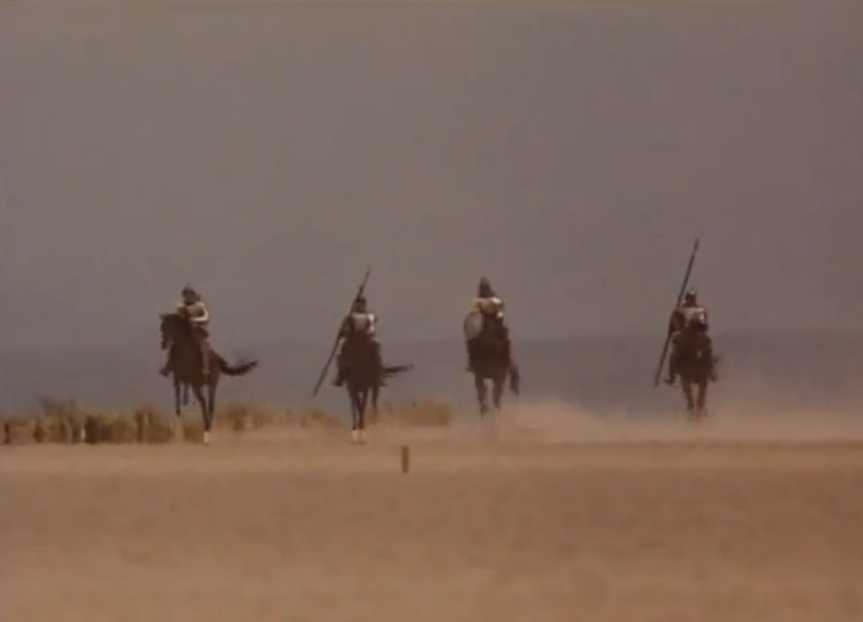 Четыре патрульных всадника в пустыне символизируют спасение для одних и гибель для других. Они напоминают всадников апокалипсиса, которого так боялись южные индейские цивилизации. Символично выглядит сцена, где Альвар Нуньес хочет поцеловать крест, но в последний момент одумывается, понимая, что старая привычка себя изжила. Господь не принимает участие в завоевании Нового Света. На ум приходит цитата из романа Абеля Поссе: «Единственный крест, блиставший там, был крест рукоятки толедских мечей». Конкистадоры верили в силу единого Бога и с молитвами на устах и оружием в руках строили новый мир, не задумываясь о судьбе тех, кто населял эти земли.