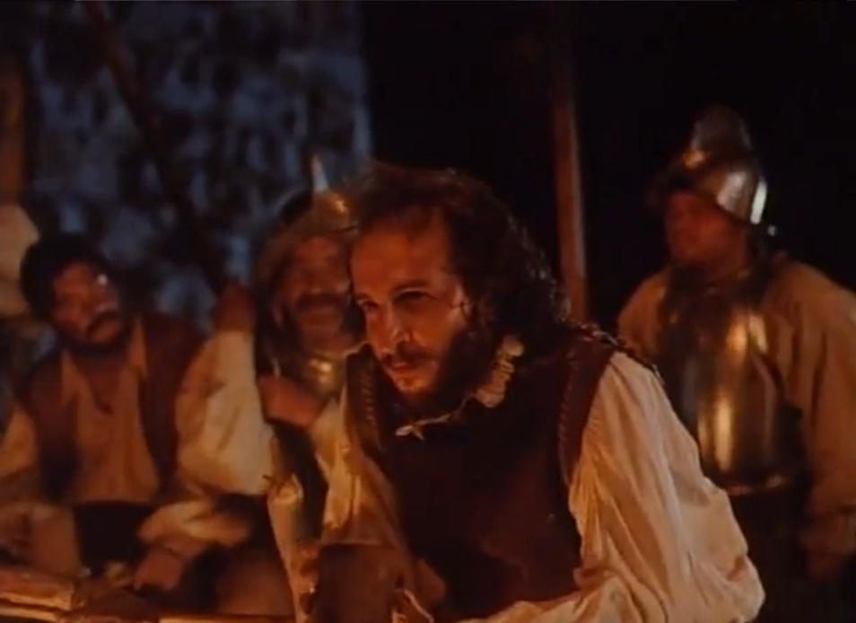 Однако это преображение было бы неполным без отторжения. Спутники его те самые «типичные конкистадоры», какими их привыкла видеть публика. Капитаны Кастильо и Дорантес – прямая противоположность своего предводителя. Они тяжело переносят скитания, с презрением относятся к языческим ритуалам и мечтают о золоте. Для них возвращение в цивилизацию невиданная благость. С каким восхищением они принимают дарованную одежду и как пируют, рассказывая небылицы о золотых городах!