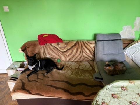 С кошкой отношения у них сложные, но скорее дружеские, чем враждебные: они время от времени гоняются друг за другом, делая вид, что хотят поймать и обидеть. Однако не ловят и не обижают. Кошка, правда, ругается страшным кошачьим матом, но уже заметно реже.