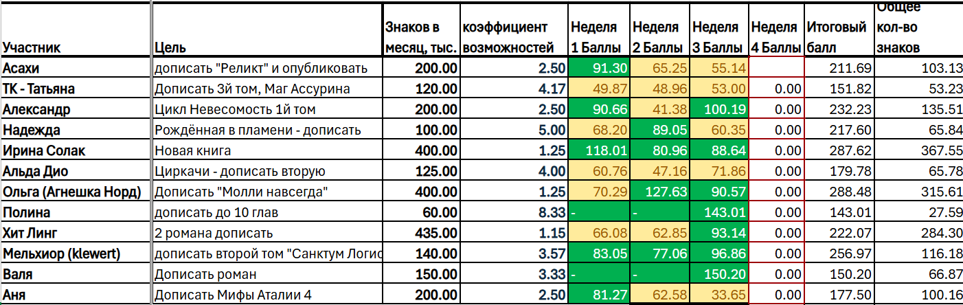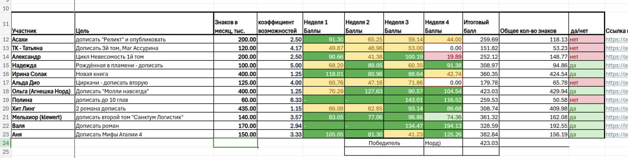 У1 написал 10К знаков и получил за первый день 10 баллов и У2 написал 4К и также получила 10 б. Т.о. работает КОЭФФИЦИЕНТ. Но вам обо всех этих деталях думать не надо. Табличка считает всё сама. Каждый идет к своей цели - СВОИМ темпом. Ведь главная цель - это написание своей книги.