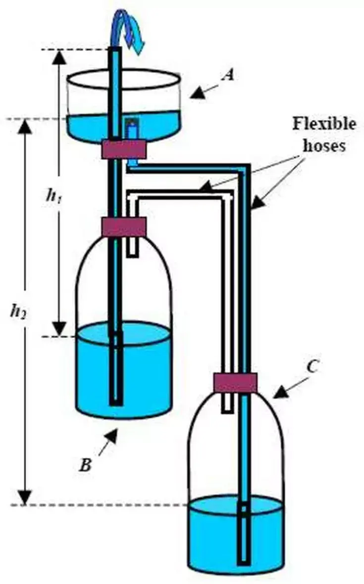 С изобретательством - то густо, то пусто. Вот сходил посмотрел на вечный двигатель, сделанный на основе фонтана Герона. Агрегат, собранный из трёх бочек с соединительными трубками, по замыслу нашего изобретателя, должен был безостановочно крутить колесо на оси силой падающей воды.