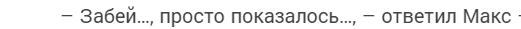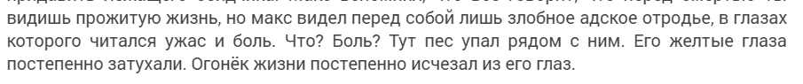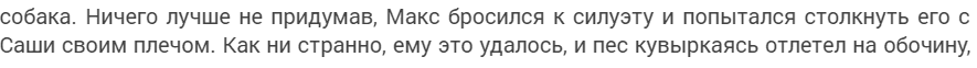 Фокал. Я понимаю, что бесполезно говорить сейчас о фокале, но давайте по-простому. У вашего персонажа условно в руках камера, через которую он показывает происходящее читателю. Вы пишете: Макс то сделал, это почувствовал, это подумал. То есть у вас фокальный персонаж ОДИН. Не надо добавлять сюда чужих собак. Вы отдаете камеру собаке, а она не знает, что с ней делать.