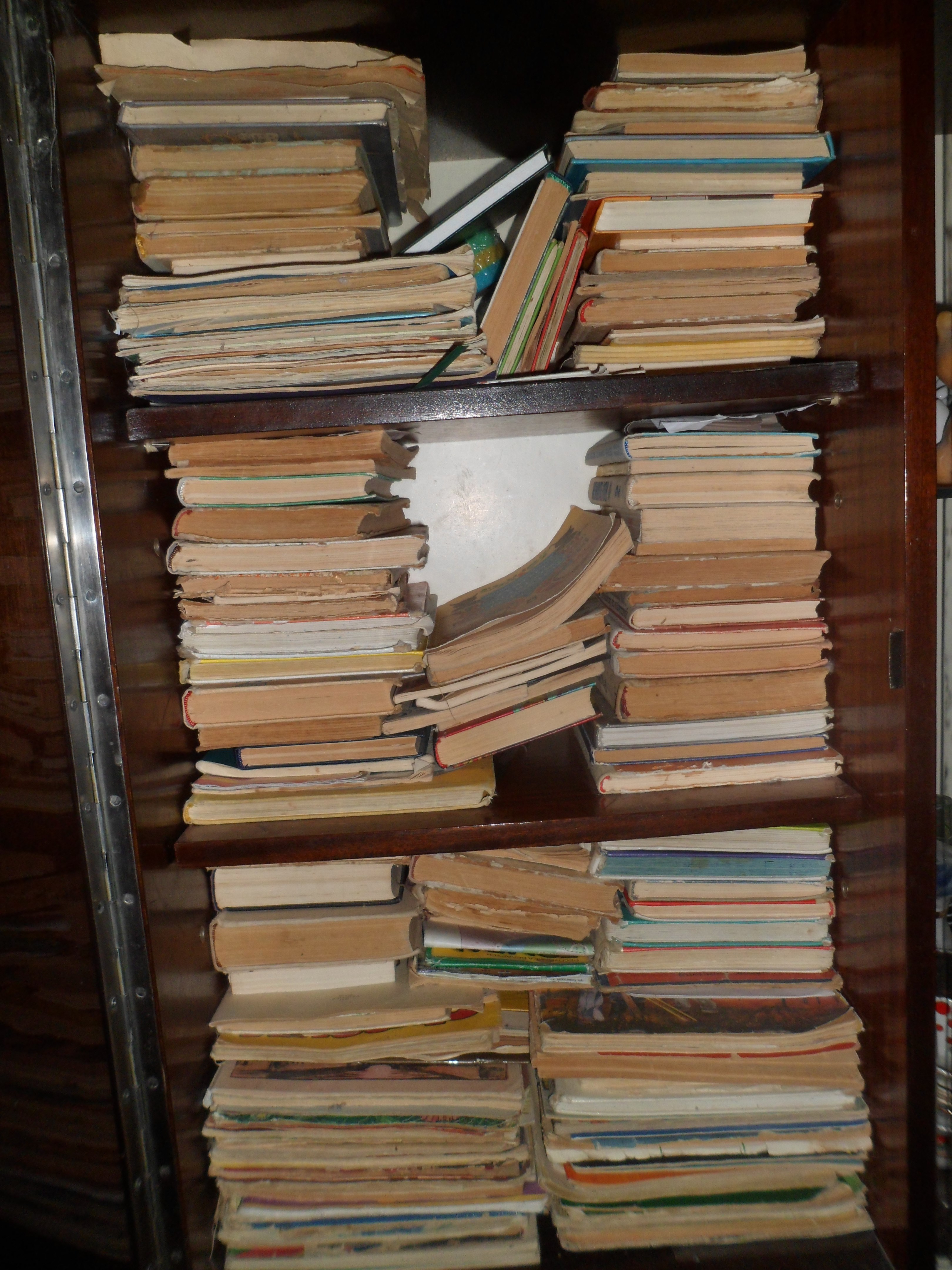 А тут энциклопедии, детские и внизу историческое, фантастика, детективы. И вверху вторым рядом тоже. За резкость сорь, не знаю, куда убежала.