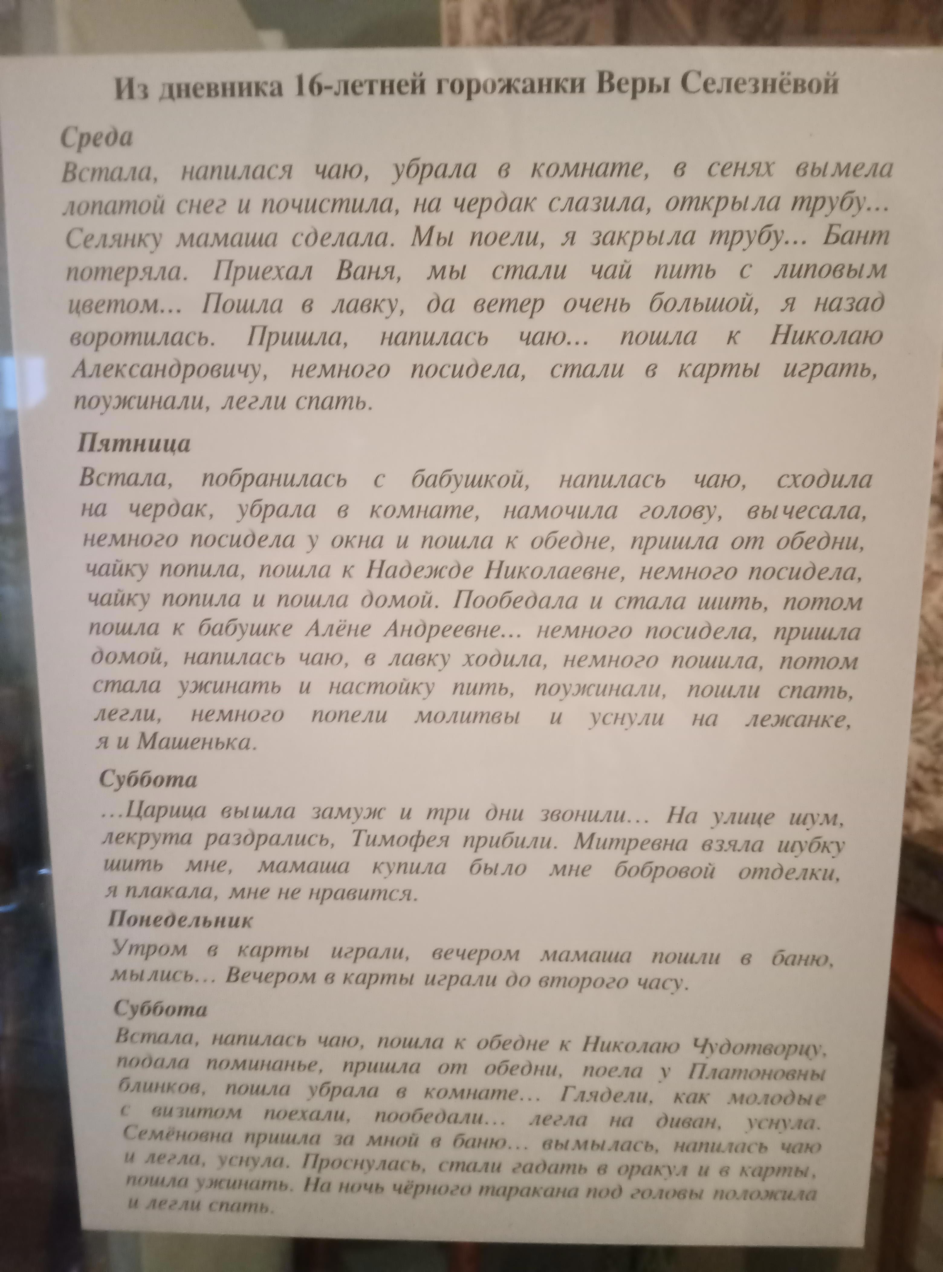 В одном из последних залов была приведена занятная часть дневника суздальской девочки-подростка 1870-х годов. Не первый раз уже его читаю - и ржу в голос с неумного потребления чая