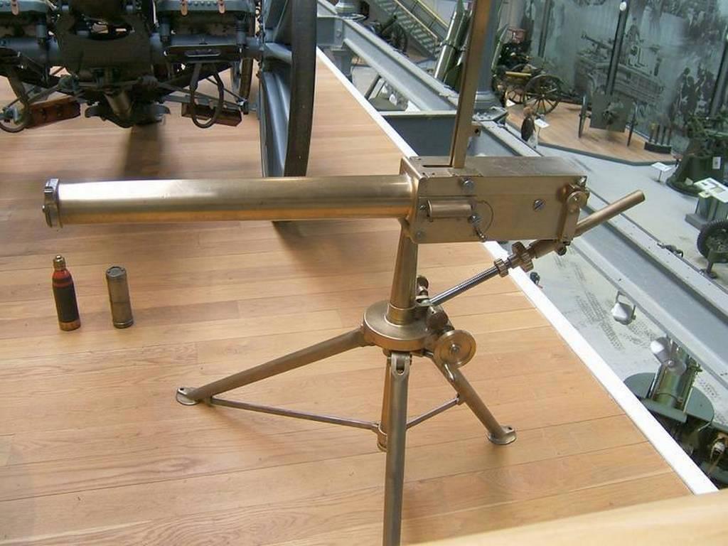А! Там же нет никакого механизма, то есть процессом в процессе руководить нельзя. Хорошо. Тогда можно вспомнить, например, митральезы Уильяма Гарднера от 1880 года и вообще митральезы. Вот посмотрите на это изделие – чем это не пулемёт? Даже по внешнему виду его трудно отличить от того же Максима, хотя на самом деле там, в латунной банке для охлаждающей воды, не один, а два ствола, которые работали по очереди: