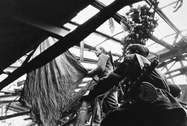 Морской пехотинец устанавливает советский военно-морской флаг в освобожденном Севастополе.