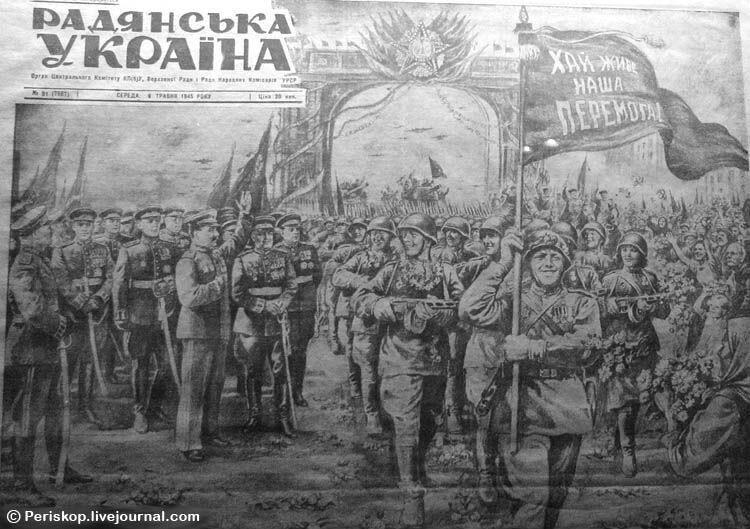 Первая страница газеты «Радяньска Украина» от 9 мая 1945 г.