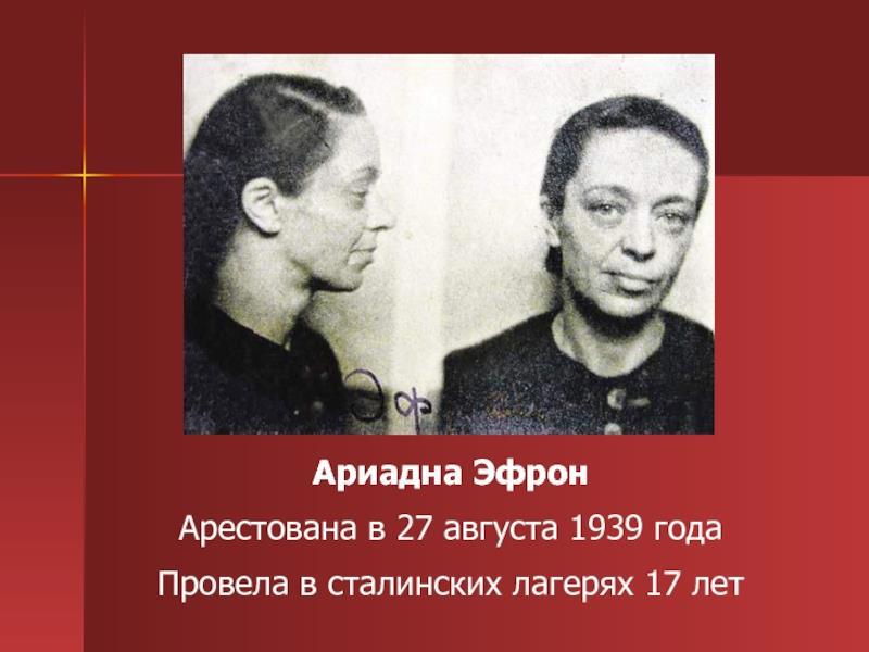 27 августа 1939 года Ариадна Эфрон была арестована органами НКВД. Её жестоко пытали, выбивая из неё ложные показания на любимого отца как на агента французской разведки. 8 марта 1955 года Эфрон получила справку об освобождении, а позже была реабилитирована за отсутствием состава преступления! Ариадна Сергеевна Эфрон похоронена на Городском кладбище Тарусы (Калужская область) Я была на её могиле и в доме-музее семьи Цветаевых. С тех пор образ этой чудесной красивой женщины не отпускает меня… и я хочу рассказать несколько коротких эпизодов из её трудной жизни…