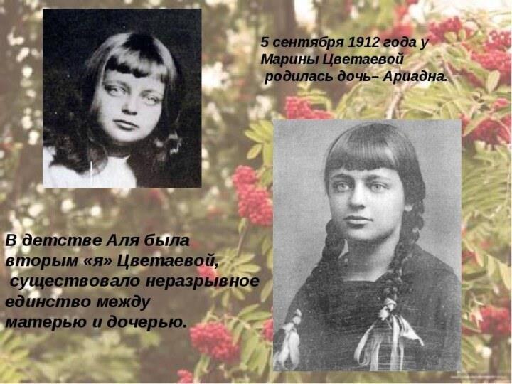 К четырём годам мать научила её читать, к пяти - писать, в шесть - вести дневник. В семь, в 1919 г., эта на редкость одарённая и не по годам развитая девочка становится наперсницей своей гениальной матери, её опорой во всех невзгодах. В те годы Ариадна - Аля, как называла её мать, - пишет свои первые стихи и, конечно же, посвящает их матери, которую она боготворила.