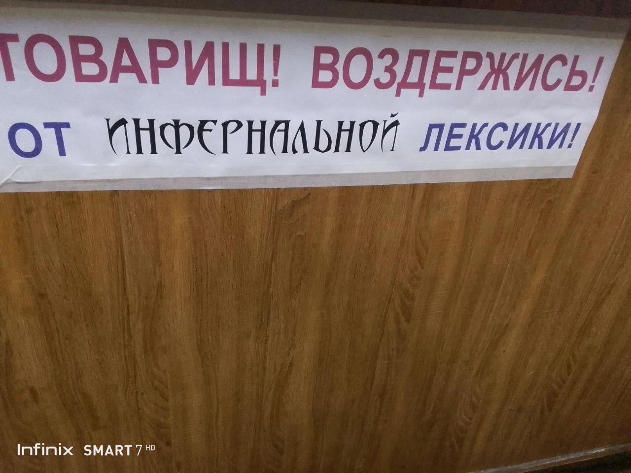 Отнюдь не приветствуется ненормативная лексика – это плакат все из той же рюмочной, где устроили выставку фоторабот.