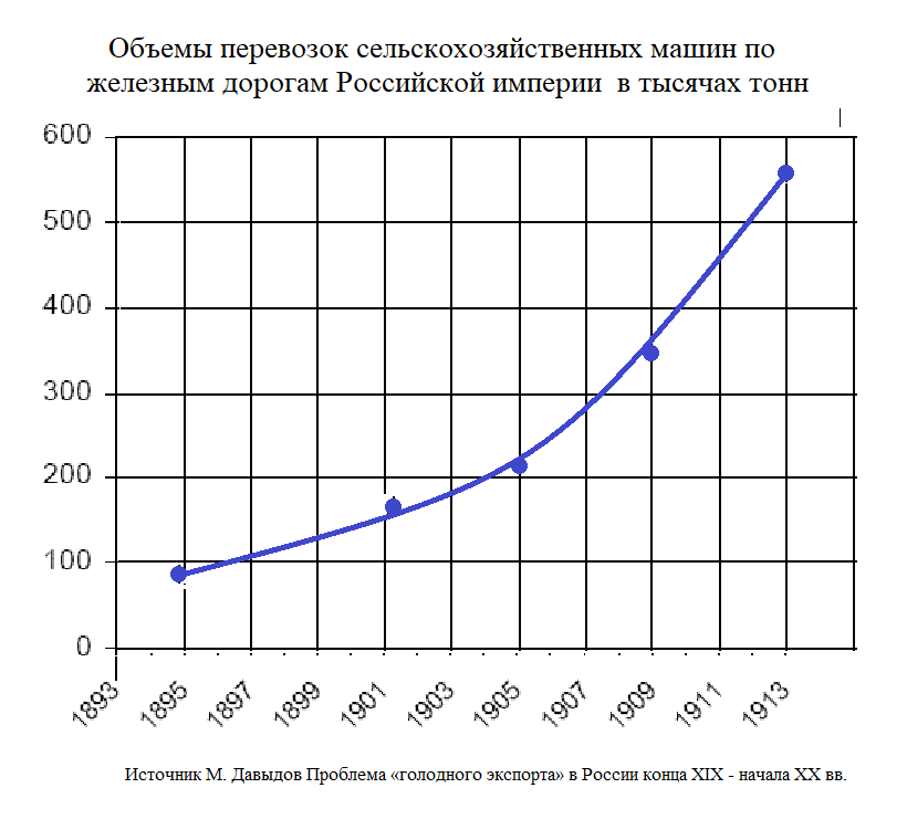 Цитата из лекции М.Давыдова "Для рассматриваемой темы, на мой взгляд, особенно важен беспрецедентный рост перевозок сельхозмашин, поскольку данное явление – едва ли не самый безусловный показатель финансовых возможностей крестьянства. В 1894 г. они составили 5 463 тыс.пуд., в 1902 г. – 10 600 тыс.пуд., в 1905 – 12 811 тыс.пуд., в 1909 г. – 21 461 тыс.пуд., в 1913 г. – 34 517 тыс.пуд. Замечу, что помещичье хозяйство в той мере, в какой это было необходимо владельцам, к началу аграрной реформы Столыпина было уже оснащено усовершенствованной техникой."