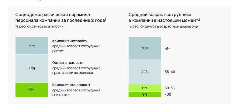 - Несмотря на целенаправленную политику по привлечению и найму молодых специалистов, лишь каждый четвёртый участник исследования отметил, что средний возраст сотрудников снизился за последние 2 года.