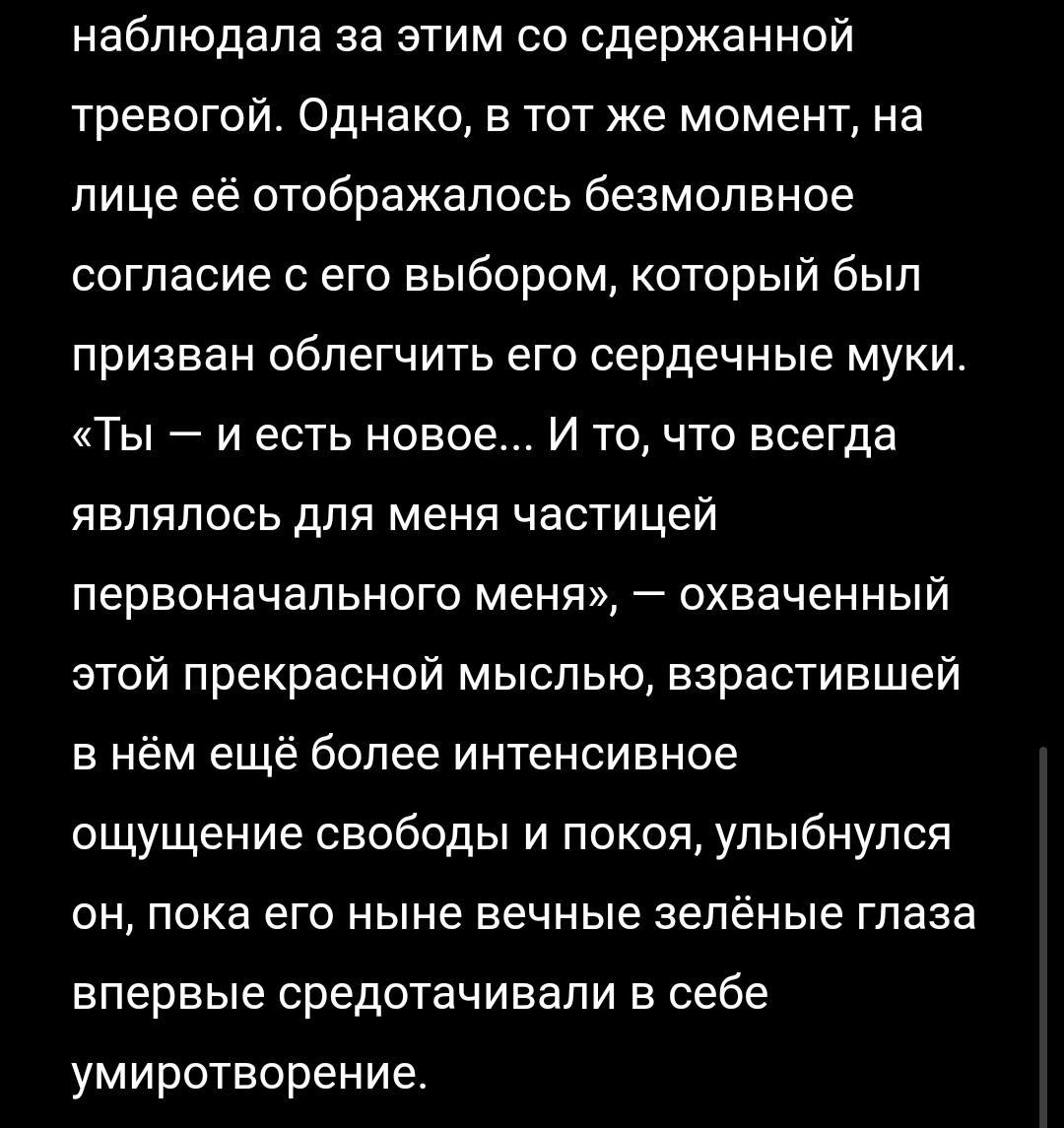 Это был маяк. Знак того, что она здесь. Что она уже считает его пространство достаточно безопасным, чтобы принести сюда кусочек своего мира, который любила, не опасаясь грубой насмешки или разрушения. И оно... действительно больше не вызывало в нём негативного отклика.