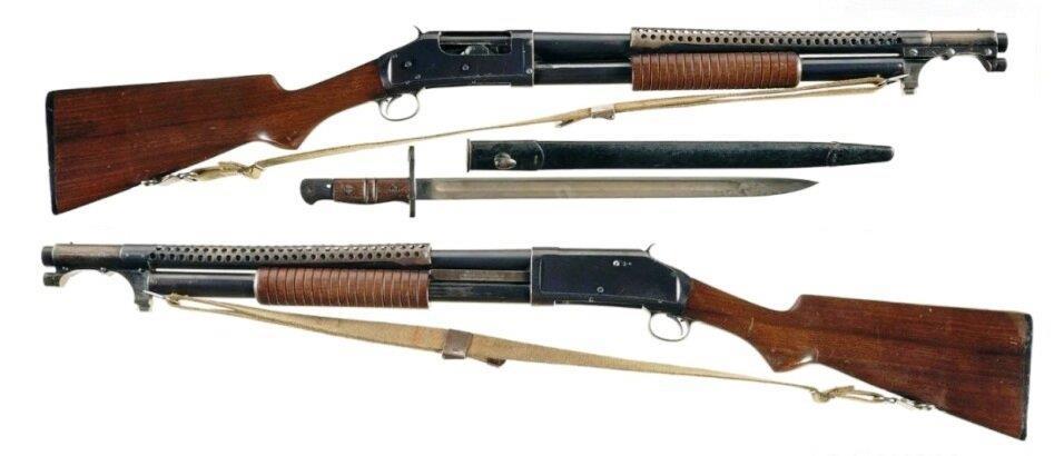 В ходе Первой мировой войны американцы приняли на вооружение армии дробовик Джона Мозеса Браунинга «Винчестер» обр. 1897 г., обозначив его как «траншейное ружьё» (Trench Gun Winchester Model of 1897). Причиной принятия на вооружение армии охотничьего дробовика стала острая необходимость в обеспечении штурмующих укрепления противника частей эффективным оружием ближнего боя - для «расчистки» вражеских траншей от солдат противника.