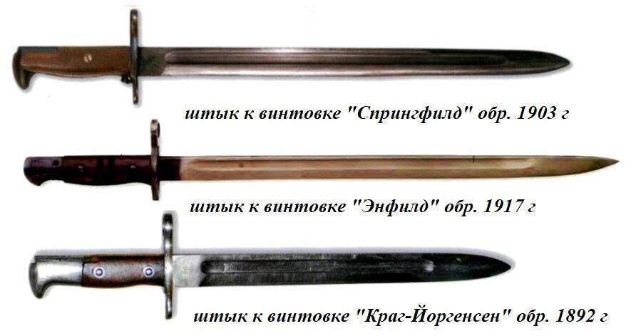Основным американским штыком в Первой мировой войне являлся штык обр. 1905 года к винтовке «Спрингфилд» обр. 1903 г. Штык с клинком 40,5 см при общей длине в 52,5 см явно не соответствовал новому характеру войны. Так же, как и еще более длинный (54,4 см) штык к винтовке «Энфилд» обр. 1917 г., вовремя дополнившей нехватку «Спрингфилдов». И даже более короткий, чем эти штыки, 41,7 см штык к устаревшей винтовке «Краг-Йоргенсен» все же не мог служить удобным холодным оружием в рукопашной схватке в тесноте траншей. Тем не менее, ввиду относительно ограниченного участия американских войск в боях на европейском театре военных действий в Первую мировую, эти штыки почти не укорачивали, как то массово делали более долго участвовавшие в траншейных рукопашных боях солдаты британской и французской армий.