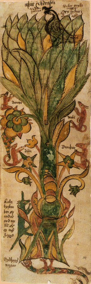 Тогда спросил Ганглери: «Где собираются боги или где главное их святилище?» Высокий ответил: «Оно у ясеня Иггдрасиль, там всякий день вершат боги свой суд». Тогда сказал Ганглери: «Что можно сказать о том месте?» Равновысокий отвечает: «Тот ясень больше и прекраснее всех деревьев. Сучья его простёрты над миром и поднимаются выше неба. Три корня поддерживают дерево, и далеко расходятся эти корни. Один корень — у асов, другой — у инеистых великанов, там, где прежде была Мировая Бездна. Третий же тянется к Нифльхейму, и под этим корнем — поток Кипящий Котёл, и снизу подгрызает этот корень дракон Нидхёгг. А под тем корнем, что протянулся к инеистым великанам, — источник Мимира, в котором сокрыты знание и мудрость.