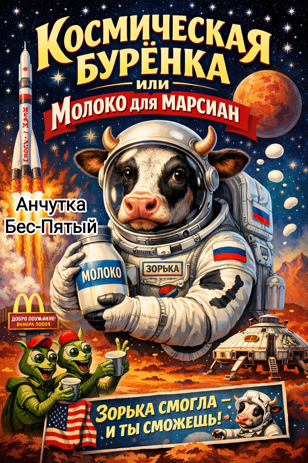 Обновлял старый рассказик про корову, робот нарисовал мне такую насыщенную обложку, что захотелось поделиться.