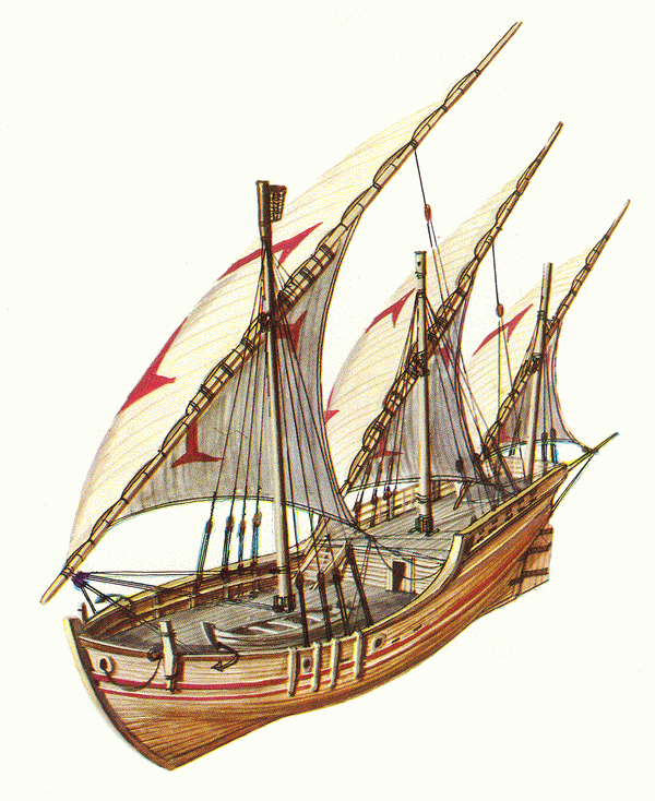 Фактически, каравелла 13 века это судно около 20 тонн водоизмещением, имеющее довольно острые (по сравнению с "круглыми" кораблями, да и поздними справедливыми тоже) обводы, обшивку вгладь, навесной руль и одну-две мачты с латинскими парусами.
