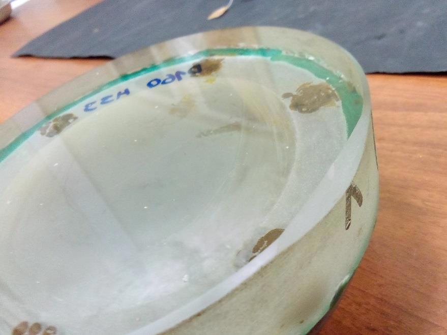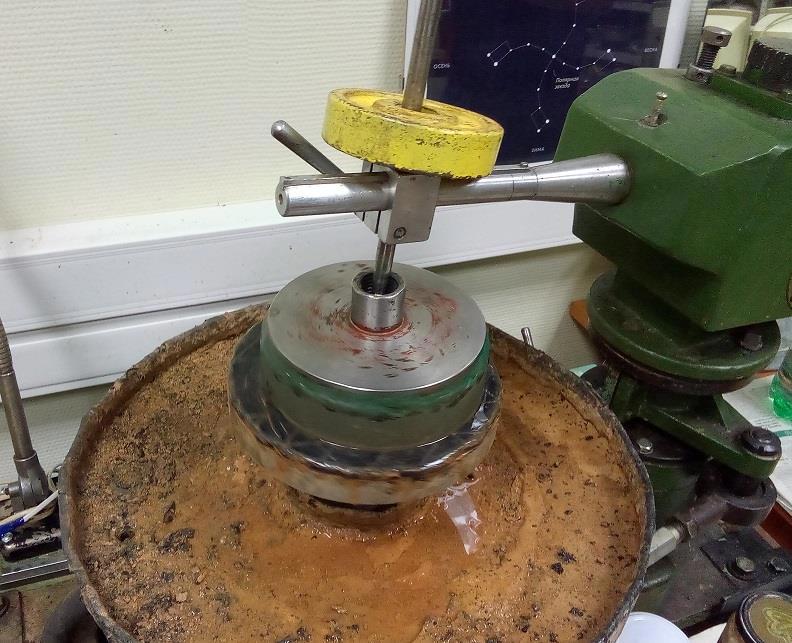Мои эпизодические походы в Астрокомплекс при МПГУ в последние две недели оказались менее удачными, чем я надеялся. Для начала я подпортил фигуру зеркала из-за неверно выбранного режима полировки. Слишком уж высокие резьбовые хвостовики у план-шайб зеркала и полировальника, да и сама стекляха толстая. Тут и опрокидывающий момент, и поводок терся о края ямки в металле, а в результате зеркало иной раз просто подпрыгивало. Закономерный итог: сорванный край. Под ним понимается узкий (обычно не более 2-3 мм), но резкий завал на краю зеркала. Кроме того, терка стекла вскрыла маленькую трещинку, и на краю зеркала возникла маленькая же выколка. Непорядок.