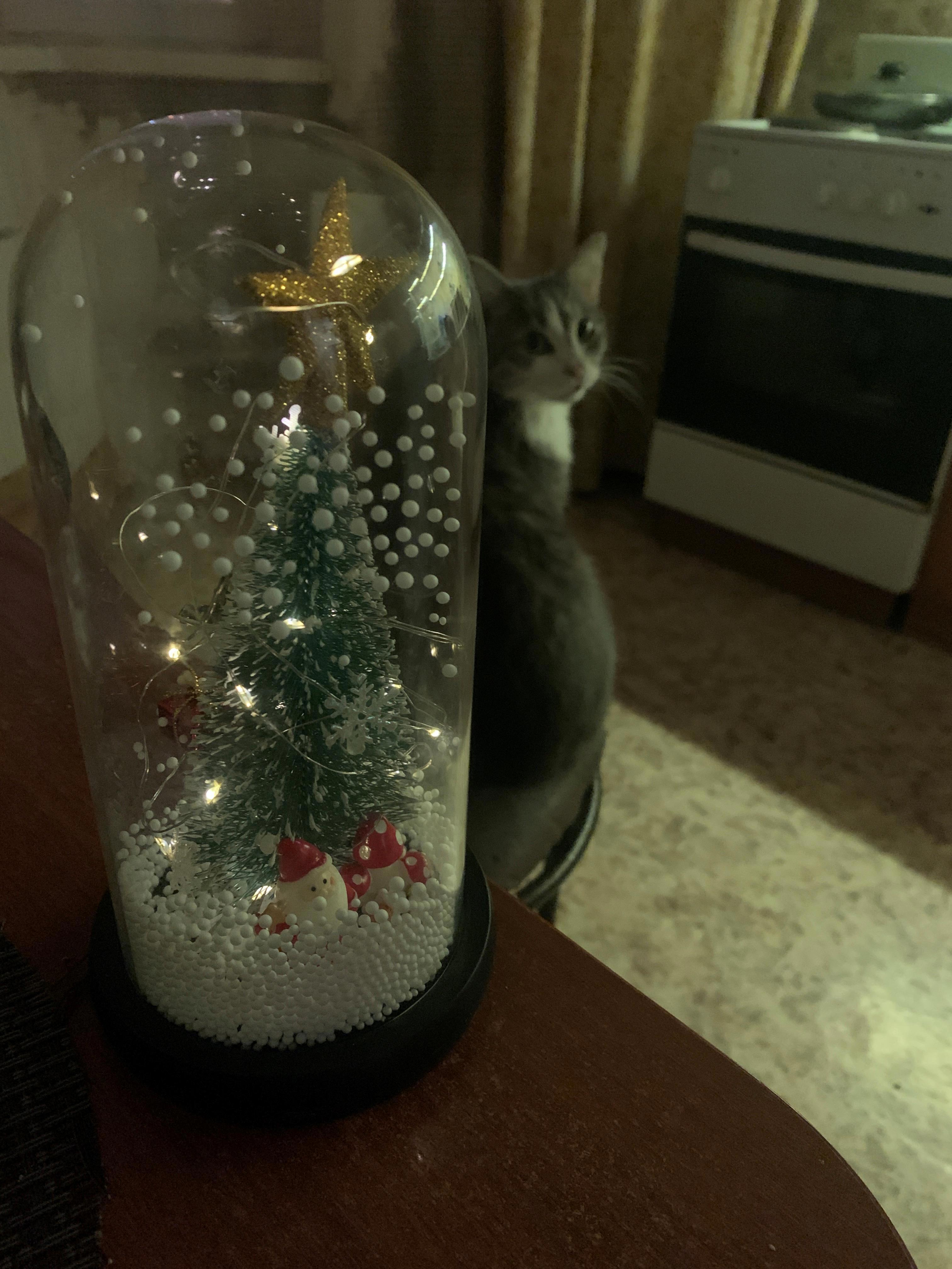 У меня три кошки и кот. А та, что у вас сейчас на экранах - самая шкодная. Вот, какую елку я могу себе позволить)