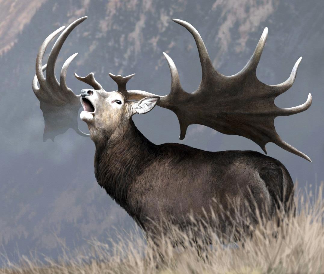 Это реконструкция вымершего животного, которое хорошо известно исследователям под названием «большерогий олень» или по-научному Megaloceros giganteus. Размах его рогов – около 4 метров. Места его обитания по мнению современных учёных вытянуты узкой полосой от запада Европы до Байкала примерно. А ещё говорят, что он вымер примерно семь с половиной тысяч лет тому назад. Но это, как вы понимаете, чисто оценочная, среднепотлочная цифра, которой никто не присягал. А внешний вид его рогов здорово похож на «фантастические» изображения, оставленные скифами… но это так – к слову.
