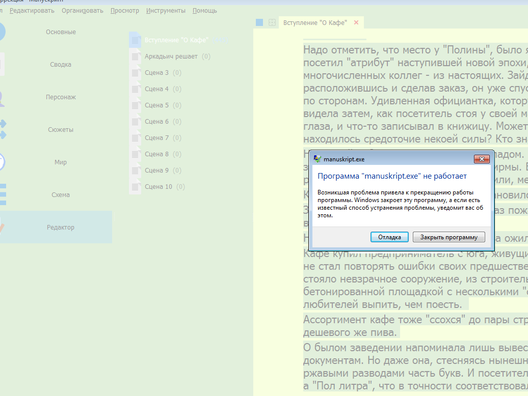 Ворд глючный и платный, бесплатные аналоги типа OpenOffice тоже "глючат" и это раздражает, то текст съезжает, то зависает, а при копирование в окно АТ появляются неожиданные разрывы между абзацами все тоже плывет. Я нашел раздел "Полезное" на АТ по софту. Там есть Scrivener 3, но 50$, понятно что ничего хорошего не бывает задаром, но раз уж так серьезно, то наверно разумно его приобретать когда у тебя хотя-бы КС на АТ и на половину этой суммы что-то продалось, да хоть на пятую часть, да хоть на 1$ продалось, тогда можно почувствовать хоть какой то здравый смысл в покупке. А графоману покупать Scrivener 3, это думаю уже клиника. В общем установил бесплатный Manuskript, и немного повозившись понял, что просто редактора писателю графоману мало! Нужен редактор и органайзер, что бы главу разбивать на куски с заметками что там делается, общий план главы и всего произведения в целом, очень удобно. Вроде бы все ура, заполняю структуру прописываю где что происходит, очень удобно.