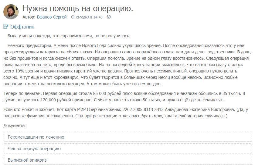 Сегодня пишу не с самой приятной новостью. У одного из авторов нашего сайта - Ефанова Сергея случилась беда, нужна срочная помощь в лечении его жены.