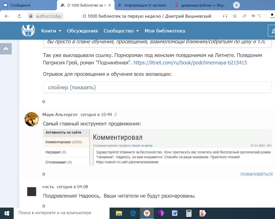 Как выяснилось, сам Вишневский нашел свою нишу на Литнете и под женским псевдонимом от первого лица пишет о том, как ебут его героиню. Он научился зарабатывает некоторые деньги, продавая такие тексты. Используя спам-рассылки и другие механизмы, доступные на Литнете, он доказал, что за неделю там можно набрать "1000 библиотек". Я не знаю, как работает Литнет. У меня есть подозрение, что его механизм несколько отличается от механизма АТ. Здесь можно отключить механическое включение в библиотеку текста, который просматривал. Там, видимо, этой функции нет.