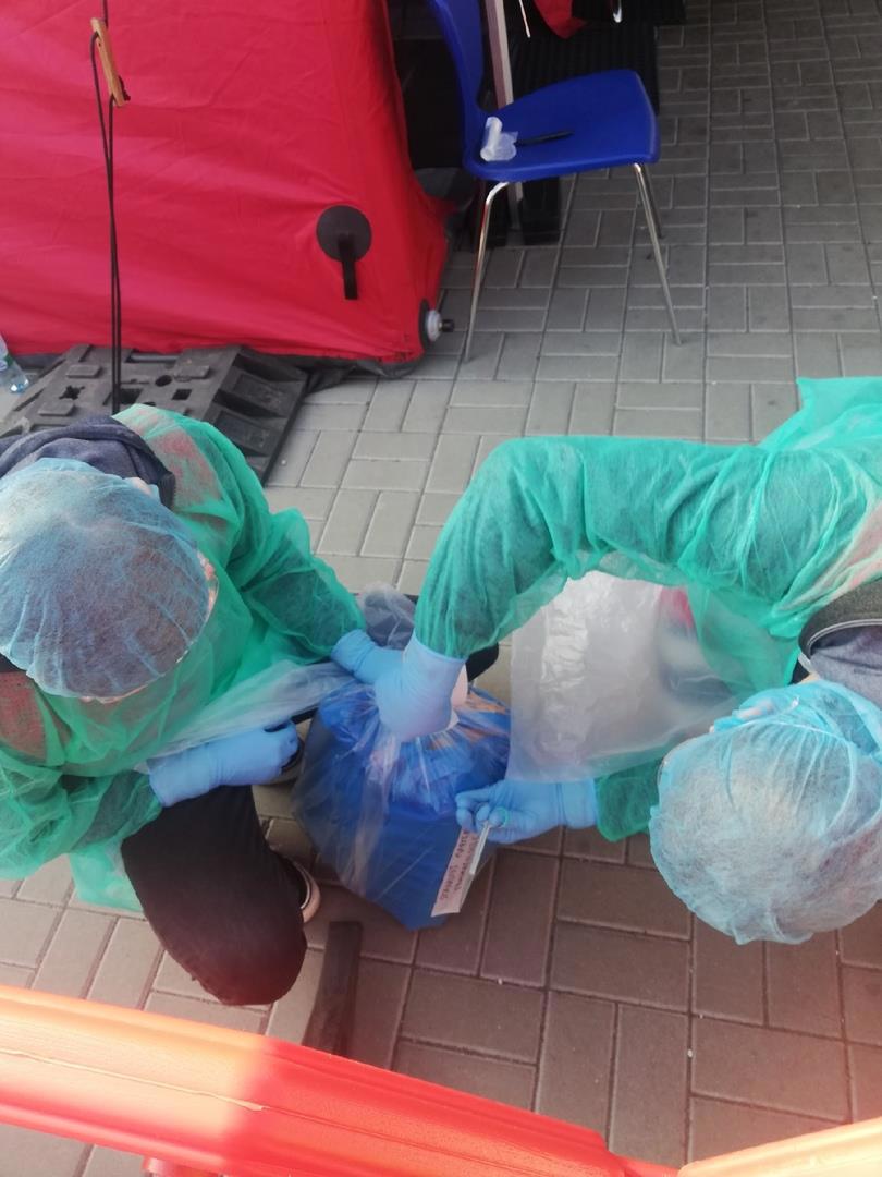 Корпус скорой помощи в Устецкой больнице. На крыше видна посадочная плошадка для вертолёта, внизу красная палатка КПП![]() | Перед этим КПП санитары в форме и поверх неё в хирургических одноразовых халатах. шапочках. масках КН95 + рукавичках загрузили сумку с одеждой, зарядным устройством и печенюшками в обычный пакетик. И заклеили скочем с именем Мартина и отделением. куда это отдадут.![]() |