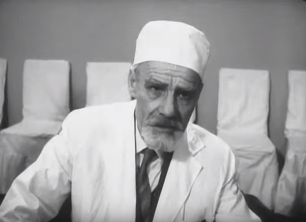 А старичок-профессор уже облачается в полный противоэпидемический костюм и приступает к выполнению своих врачебно-служебных обязанностей – осматривает того самого заболевшего врача. Пациент говорит, что он «ошибся в диагнозе», на что профессор отвечает «это трудно сказать». Ясное дело, успокаивает пациента, но как-то очень размеренно, спокойно, роботизированно и – неестественно.