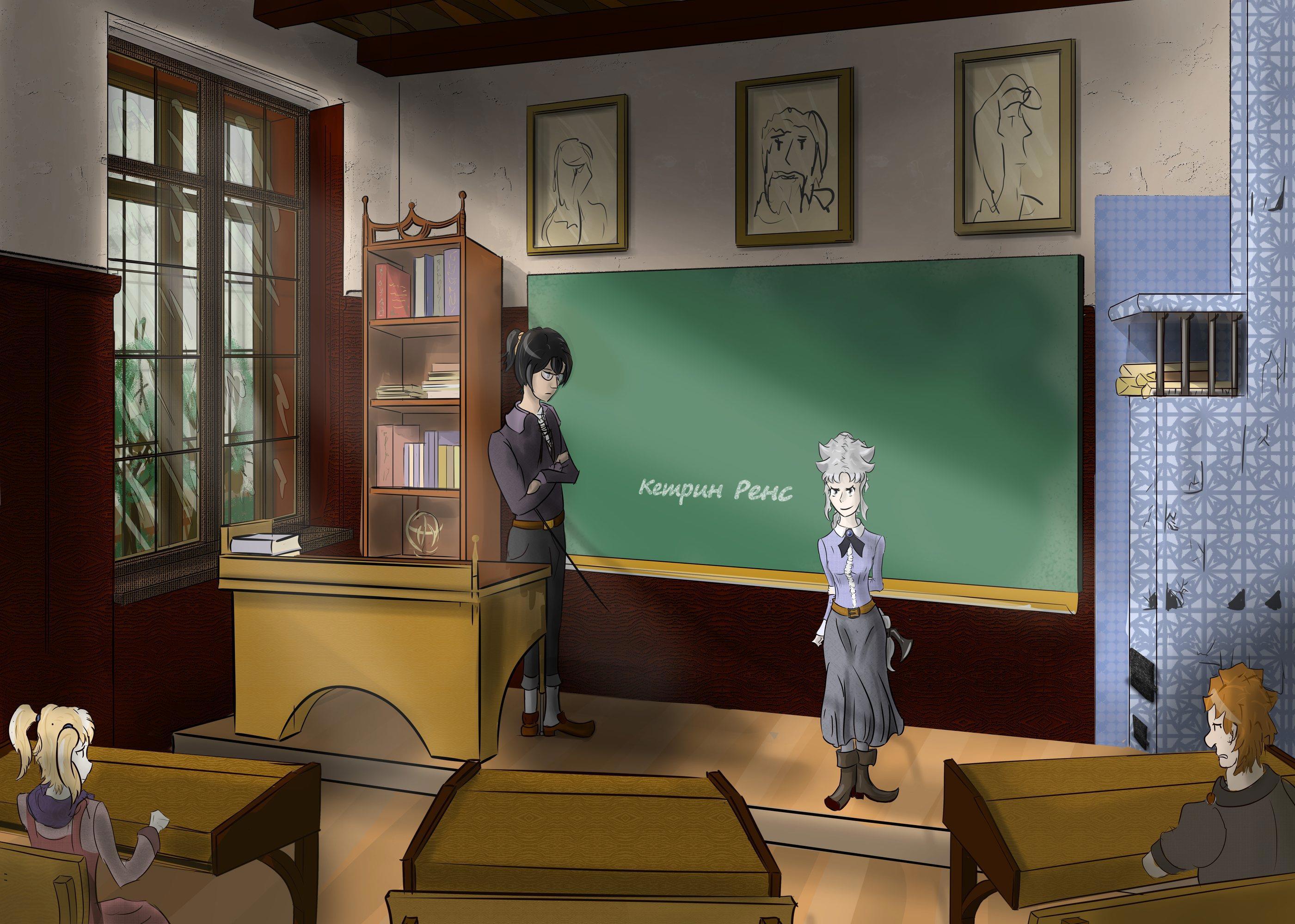 Первый раз в новом классе, День добрый, меня зовут Кетрин Ренс. Пожалуй сюжет слишком уж штамповоно анимашный, но что поделать, если уж пишу повседневку о фентези школе?