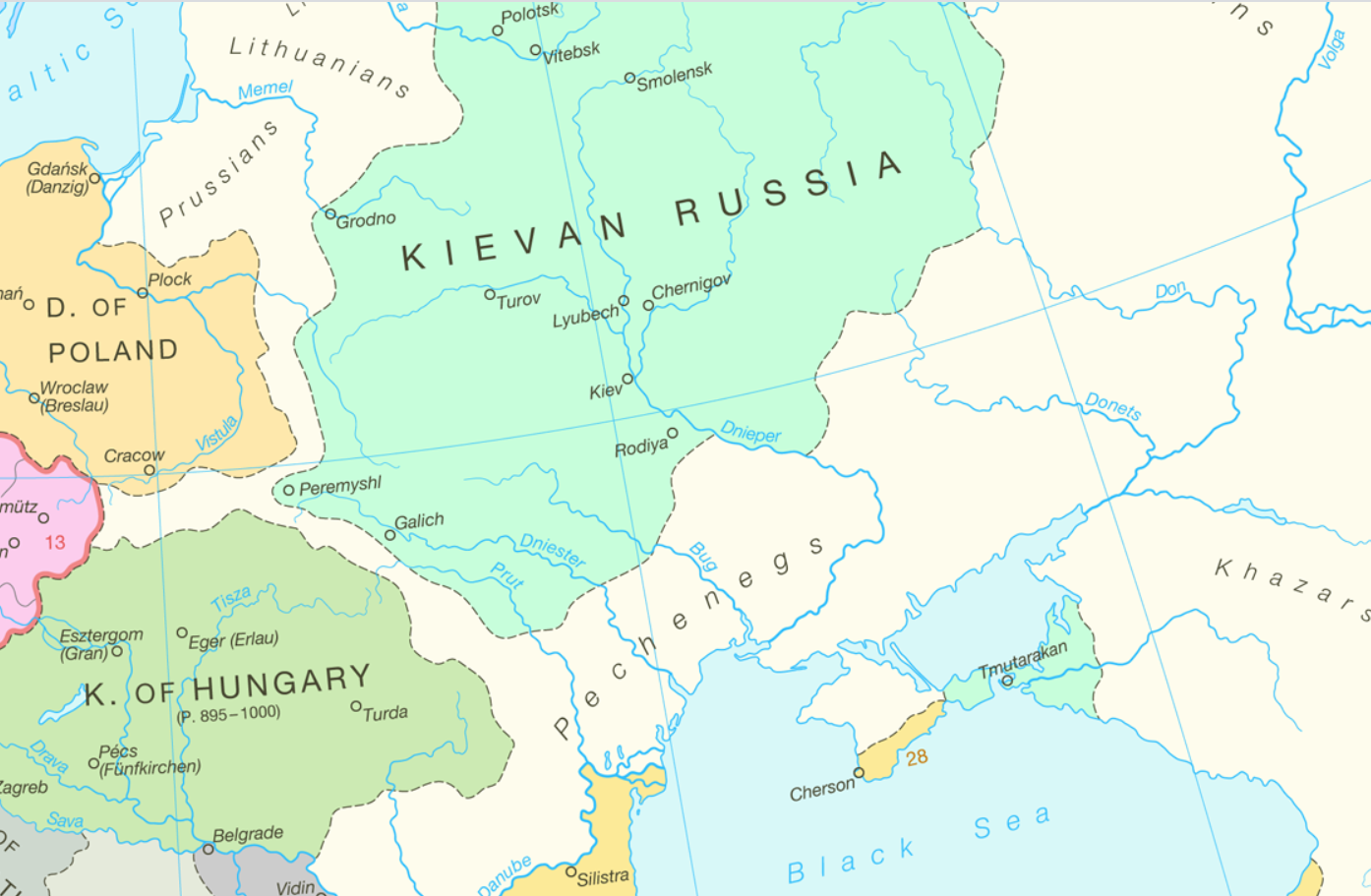 Киевская Русь тогда точных границ не имела, но имела "колонию" на Таманском и Керченским полуостровах (Тьмутараканское княжество).