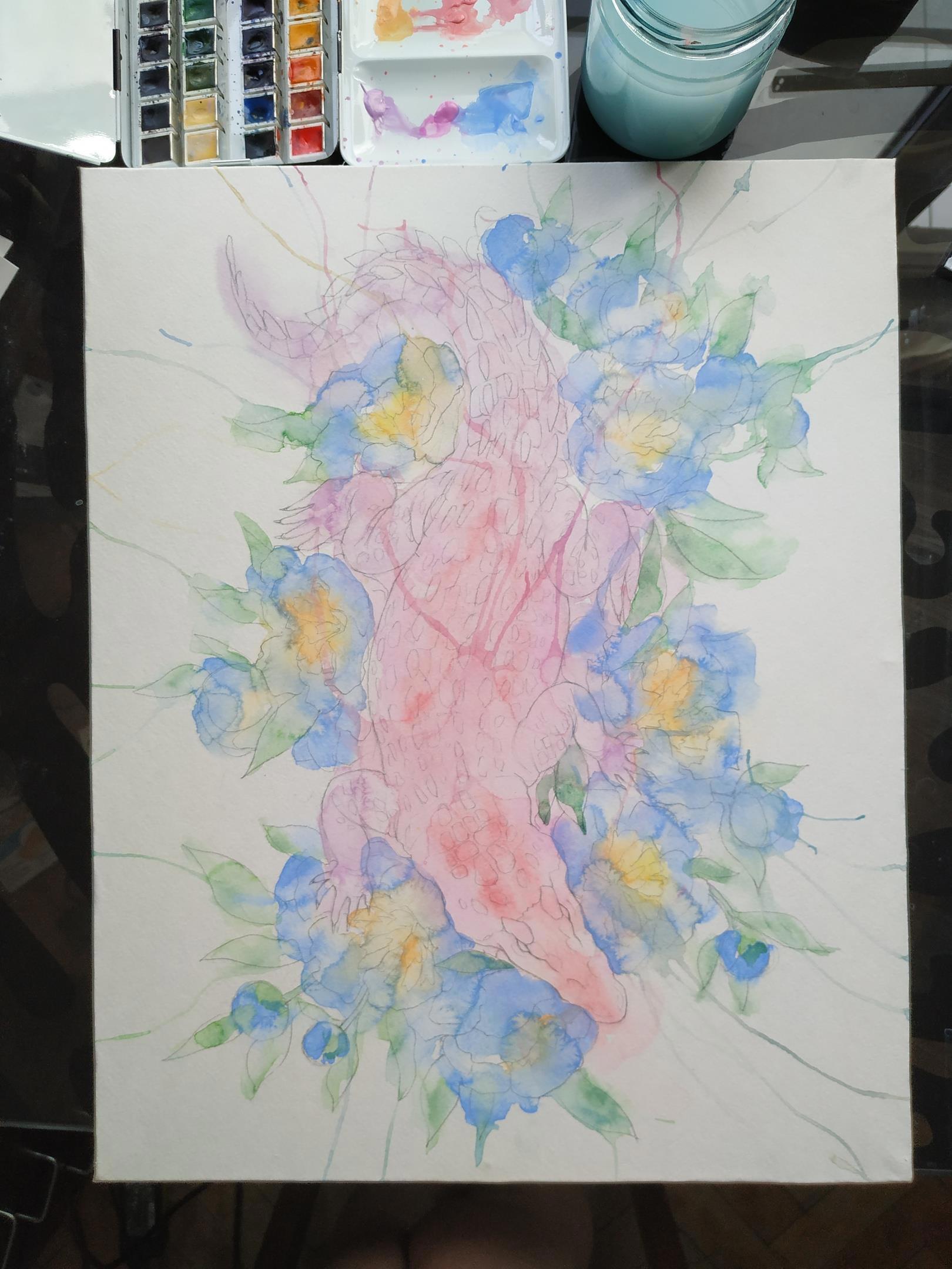 И чуть-чуть линейной проработки карандашами. Мне нравится как четкие линии визуально собирают свободно растекающуюся акварель: