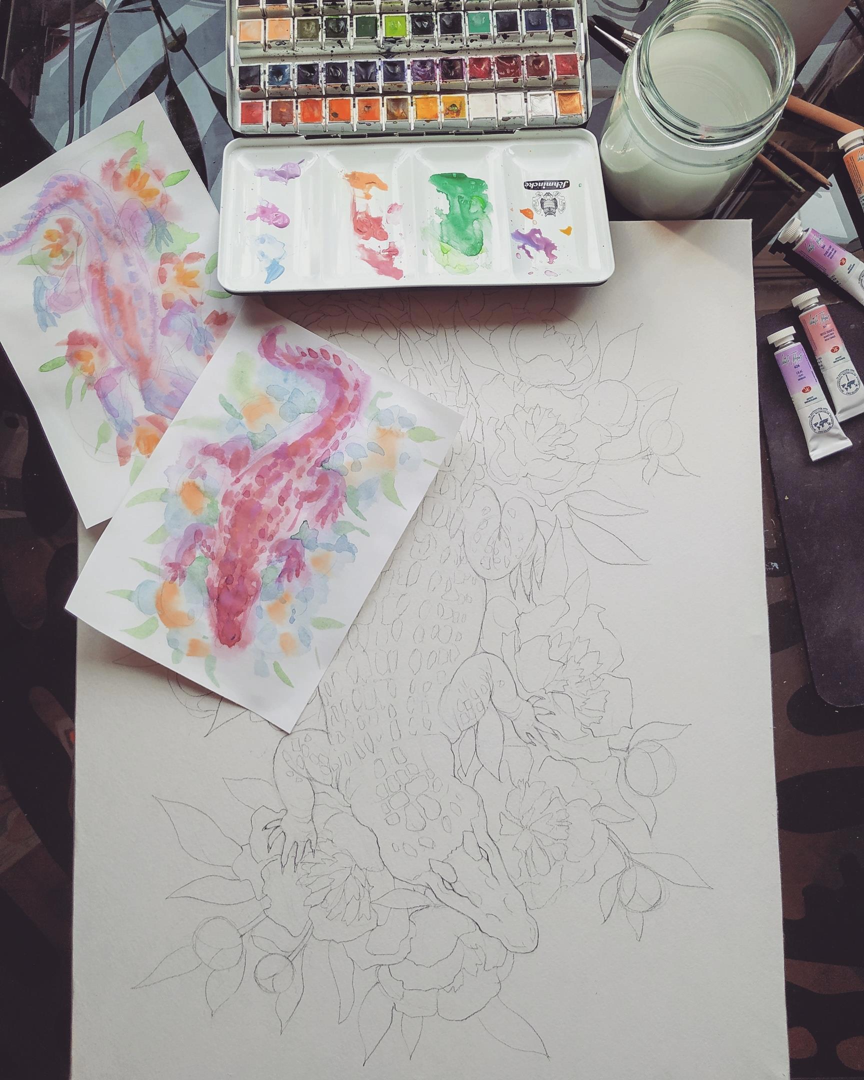 Перевела эскиз на планшет с акварельной бумагой и тонюсенько проработала карандашом: