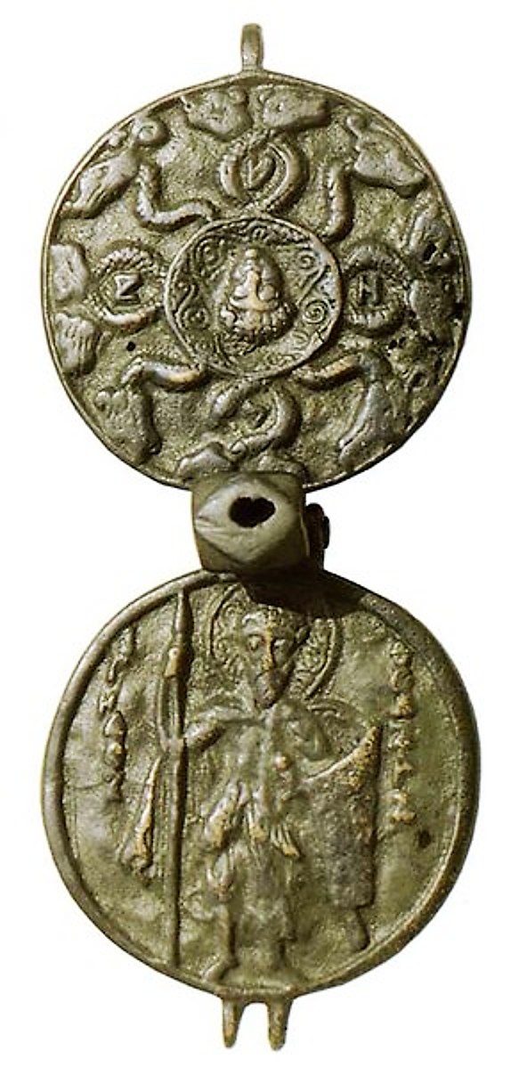 А вот на реверсе было без вариантов. Там всегда была змееногая и змееволосая демоническая женщина, у которой, по преданию, было 12 имен. В Византии. откуда к нам и пришли эти амулеты, ее называли Истера, на Руси - Дъна.