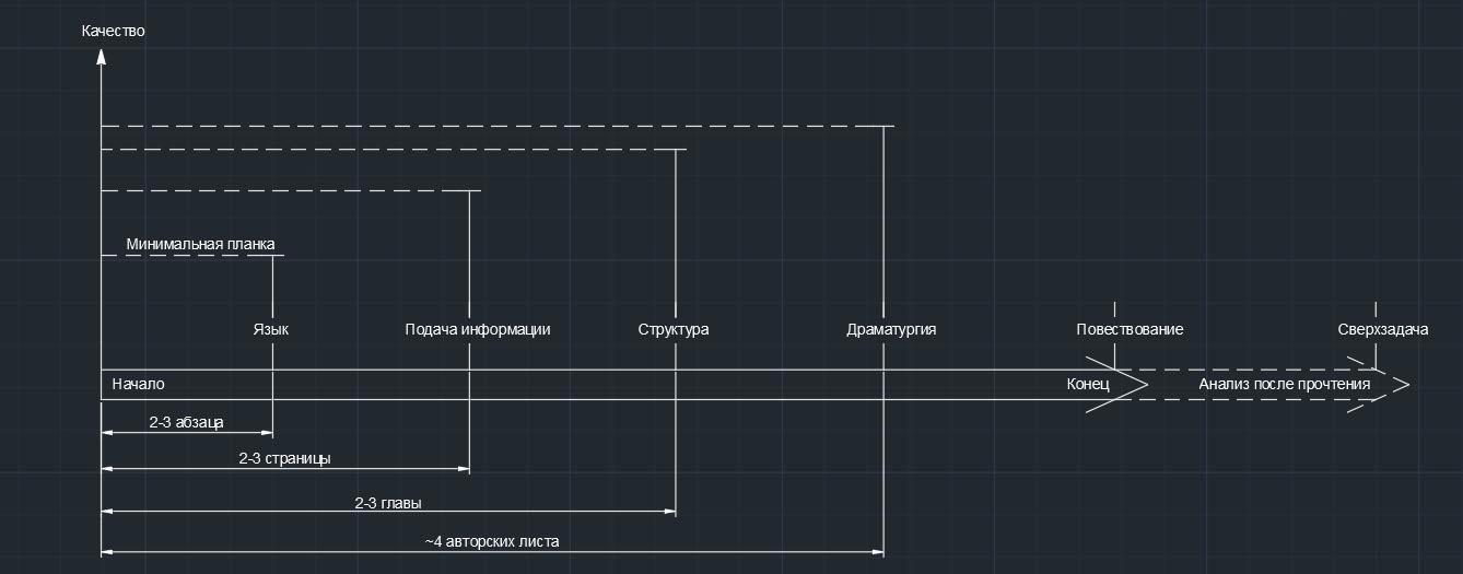 Здесь опять выпадает из общего поля идейная составляющая. Следуя этому правилу, она должна иметь наивысшую важность, однако нахождение её за пределами шкалы вносит коррективы: идейная составляющая — всего лишь дополнение, определяющее сверхзадачу. Качество книги не зависит от качества и наличия идейной составляющей — как уже говорилось выше, её и вовсе может не быть.