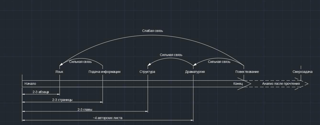 Если в хорошо написанной книге присутствует выраженная сверхзадача, то основное внимание уделяется именно ей. Это тоже довольно простой и очевидный факт, на самом деле. Мы идём по пирамиде Кактусоу, но уже в обратную сторону: нас цепляет идея, к которой крепятся повествовательная составляющая, по упомянутым выше причинам. Дальнейшие компоненты, как уже было замечено выше, не так важны.
