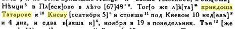 Кратко, для тех, кто не хочет ломать глаза, здесь говорится, что Татары пришли к Киеву 5 сентября и стояли там 10 недель и 4 дня, до 19 ноября.