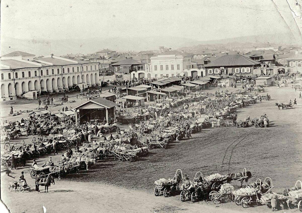 Вид на Красноярск. Собор в центре города, который был снесен после революции. Рядом центральная рыночная площадь.