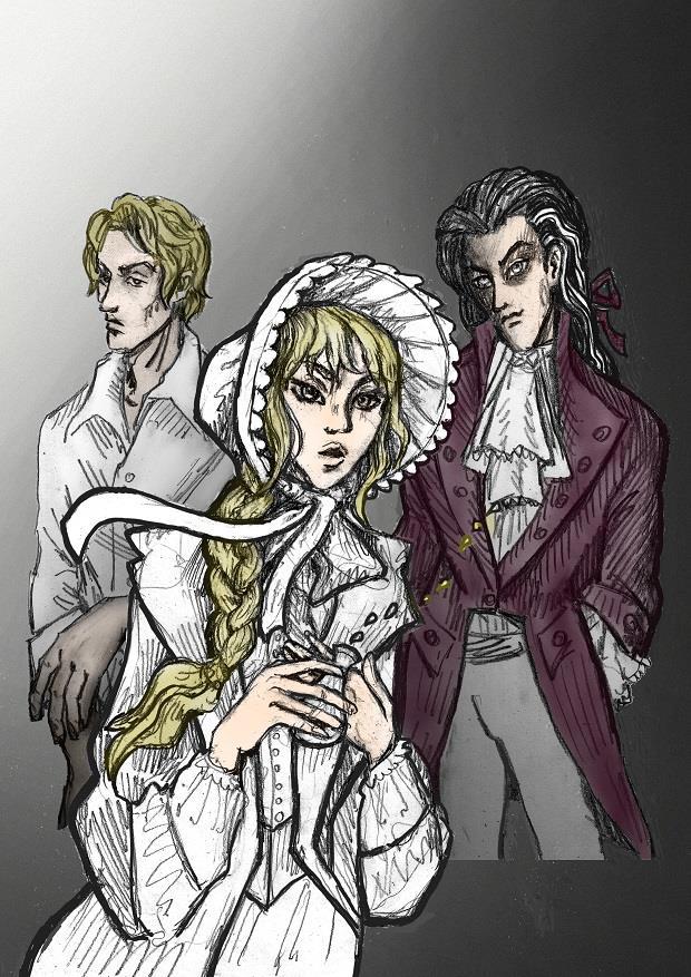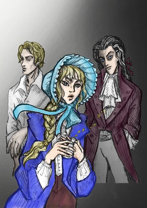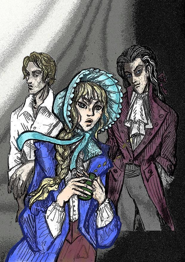Голубой капор и глаза у девушки и синие глаза у Сибора + загладила ему и Леху лицо от грубой штриховки и чуть навела подрумянца на щёчки, губы и руки Капы: